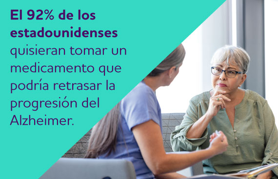 - El 92% probablemente o definitivamente quisieran tomar un medicamento que podría retrasar la progresión de la enfermedad después de un diagnóstico de Alzheimer.