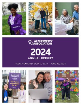 The FY24 Annual Report details mission-related accomplishments within the six strategic objectives of the Alzheimer's Association: providing and enhancing quality care and support; accelerating research; increasing concern and awareness; strengthening diversity, equity and inclusion; advancing public policy; and increasing revenue. These initiatives drive the Association's efforts to eliminate Alzheimer's and all other dementia offer help and hope to all those affected.