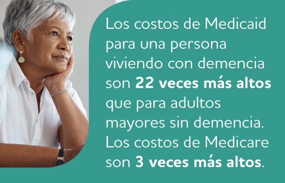• Los costos de Medicaid para una persona viviendo con demencia son 22 veces más altos que los costos para adultos mayores sin demencia. Los costos de Medicare son 3 veces más altos.