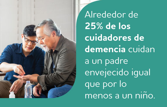 • Aproximadamente un cuarto de los cuidadores de demencia son de la “generación sandwich” — lo cual quiere decir que cuidan no tan solo de un padre de edad avanzada pero también por lo menos a un niño.