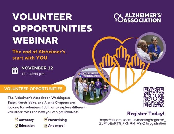 As an Alzheimer’s Association volunteer, you can make a meaningful impact for people and families impacted by Alzheimer’s and dementia in your community. With support groups, education programs, awareness opportunities, advocacy initiatives, fundraising events and more, we have volunteer options for you at the Washington State Chapter. Find volunteer opportunities near you.Support and education in your community