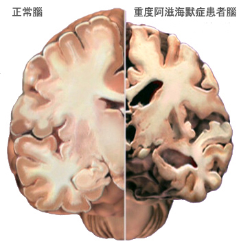 左圖(兩耳之間的腦部橫切面圖) 左半邊是正常腦,右半邊展示出 重度患者損失大量腦細胞的情況。