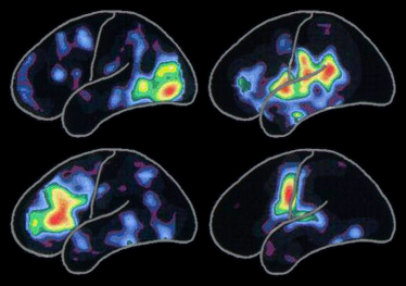 左の陽電子断層撮影法(PET)スキャンは、以下に関連する脳の活動の標準的なパターンを示します。