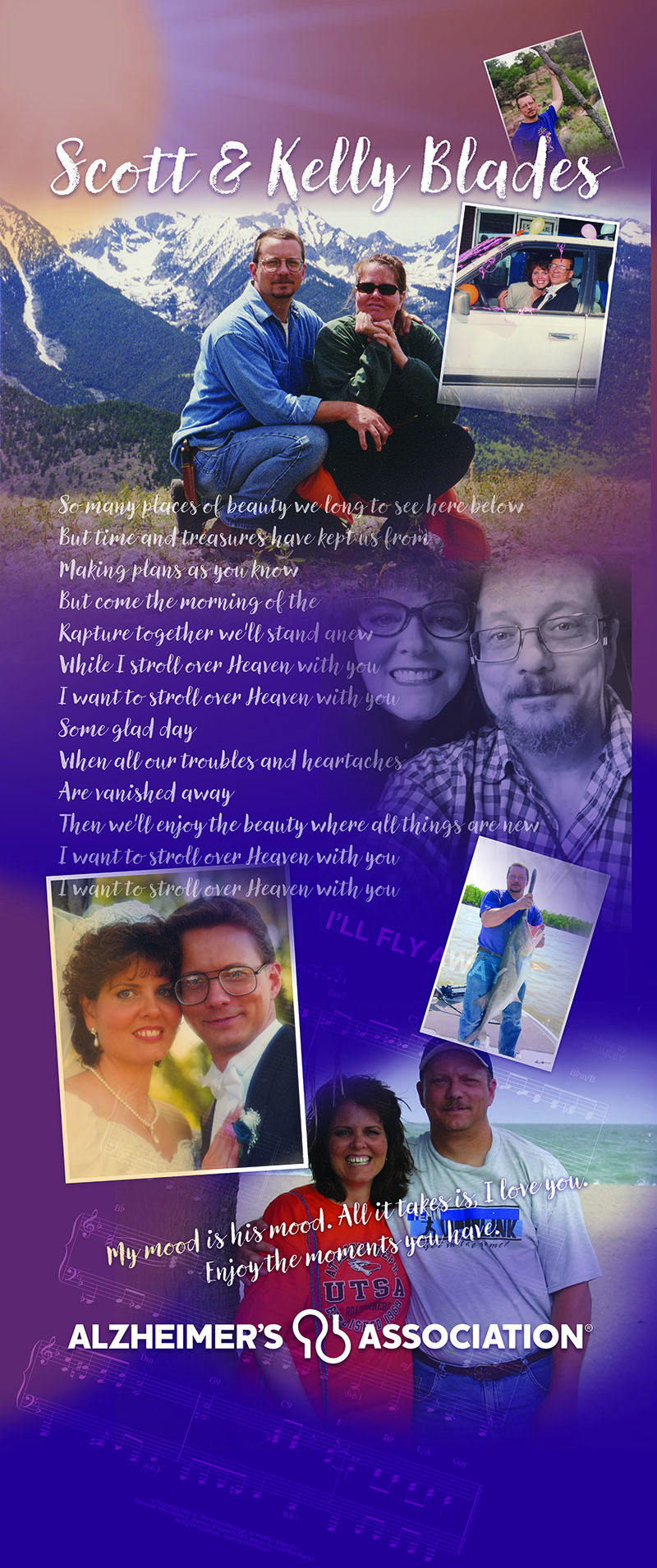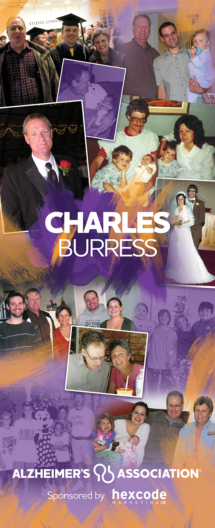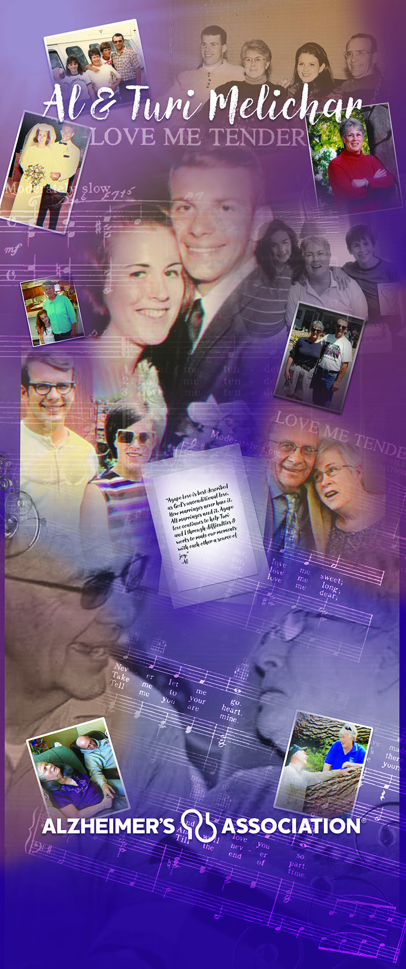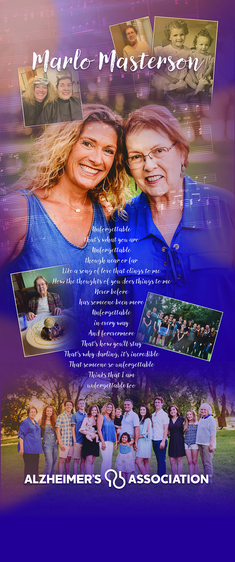 At the 2023 and 2024 Memory Galas, beautiful murals stood in the Gallery with photos and memories of six families. Their stories were told in audio format in their own words, in their own voices on headphone sets. Needless to say, Gala guests walked away learning more about the personal effects of Alzheimer's and other dementia. You can experience these murals and their audio stories right now by clicking on the images below.