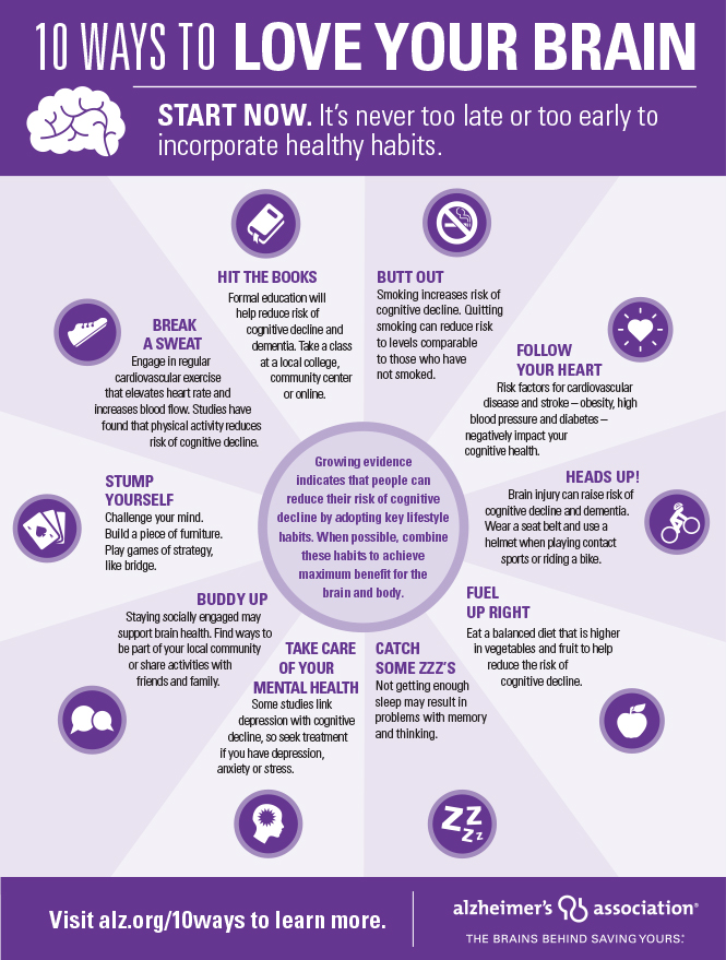 | Dear The Alzheimer's Association recently released 10 Ways to Love Your Brain — tips that may reduce the risk of cognitive decline, and possibly even dementia. And now you can support the fight against Alzheimer's disease and other dementias, while receiving a very special gift to help keep your brain healthy. |