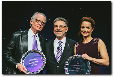 | Gurney Williams and Kimberly Williams-Paisley pose with Alzheimer's Association President and CEO Harry Johns. The actress/author and her father received the Champion Award at the National Alzheimer's Dinner April 5 during the 2016 Alzheimer's Association Advocacy Forum. The Champion Award recognizes individuals whose actions have promoted greater understanding of dementia and its effects on diagnosed individuals, families and caregivers. |