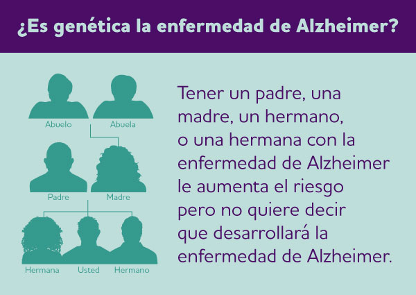 El historial familiar no es necesario para que un individuo desarrolle el Alzheimer. Sin embargo, la investigación demuestra que aquellos que tienen un padre o un hermano con Alzheimer son más propensos a desarrollar la enfermedad que aquellos que no tengan un pariente de primer grado con Alzheimer. Los que tienen más de un pariente de primer grado con Alzheimer tienen un riesgo aún más alto. Cuando existe una tendencia de enfermedades como el Alzheimer y otras demencias en una familia, tanto la genética (factores heredados) como los factores modificables como el sueño, el tabaquismo, la hipertensión o la diabetes pueden aumentar el riesgo aún más.