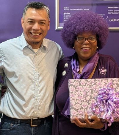 In 2025, Diane was honored as the Alzheimer's Association Southeastern Virginia Chapter's Volunteer of the Year. Diane is featured with Douglas Panto, the chapter's community programs manager."I've had a lot of people crying on my shoulder at these events that I go to, and it just warms my heart because we’re there for them as the Alzheimer's Association," she says. "We let them know they're not alone. My mom and I were blessed to have our faith, family, pastor, friends and church members with us in the journey."