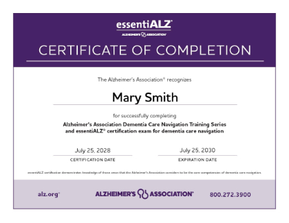 Contact us with questions about the Dementia Care Navigation Training Series. The Alzheimer's Association offers other options for dementia care training and certification, including essentiALZ for long-term and community-based care professionals.