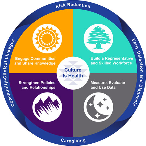 Build a Representative and Skilled Workforce: Public health is responsible for training and preparing the public health and health care workforce to provide culturally centered and appropriate care to people at risk for or living with dementia while also supporting caregivers. The cedar tree icon represents protection and healing. The diverse uses of the tree call to mind the roles of the different members of the workforce.