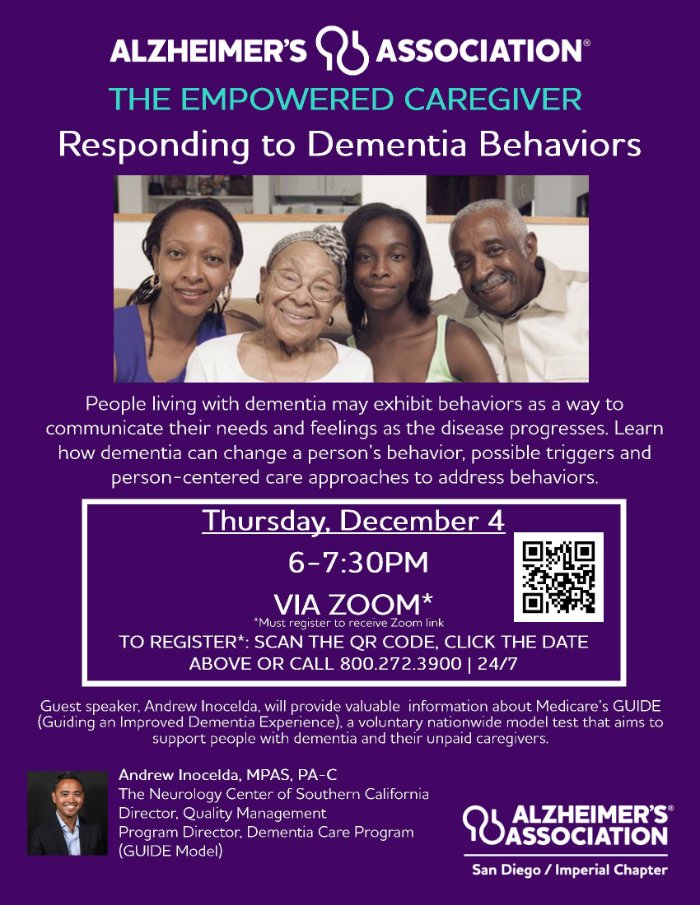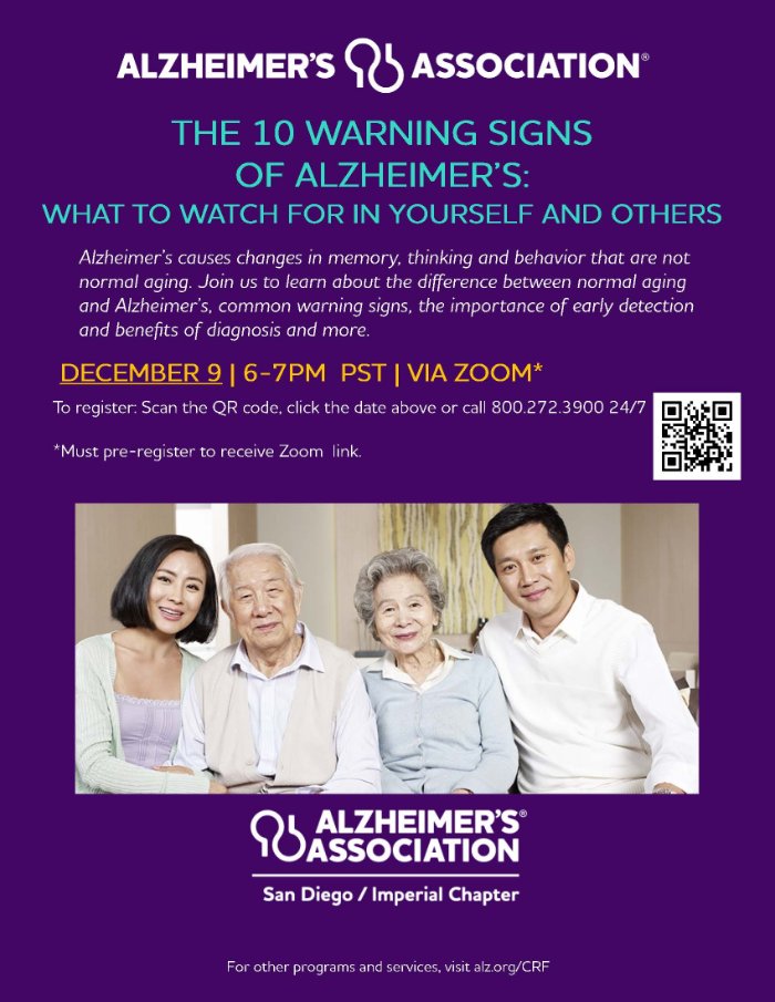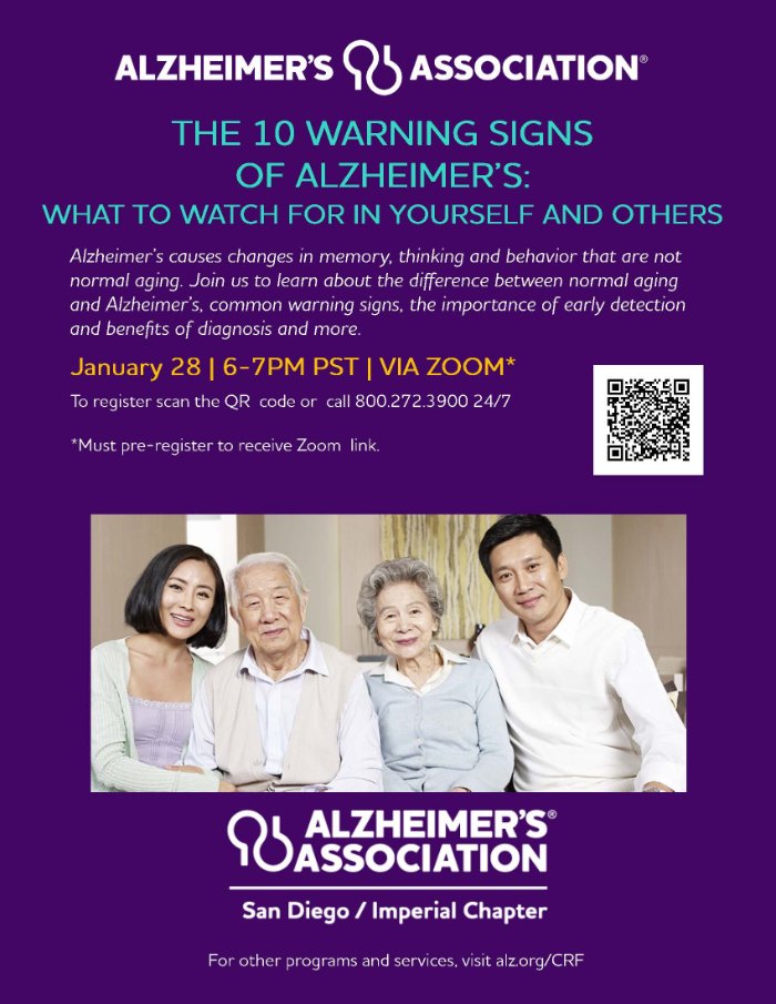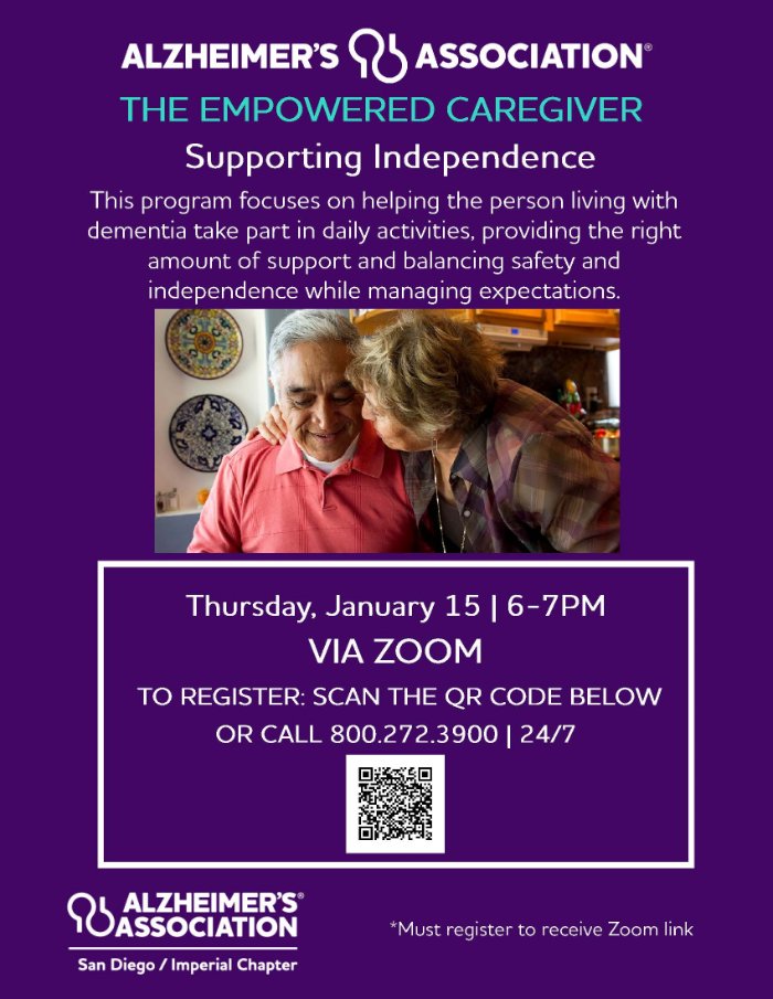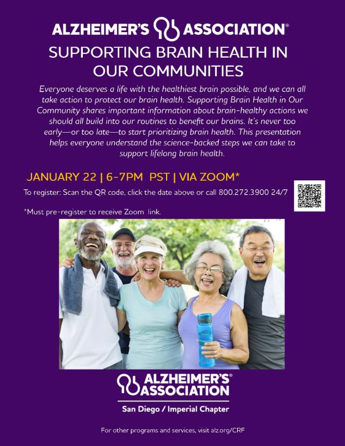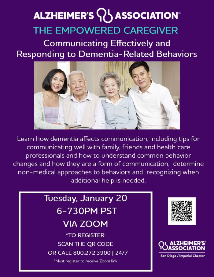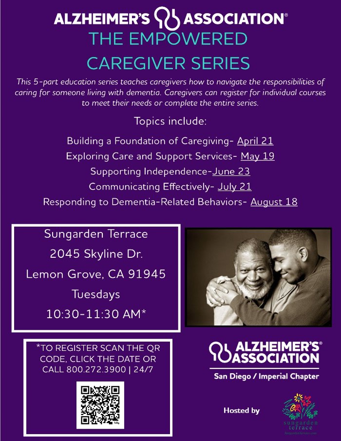 The Alzheimer's Association offers a variety of education programs to increase knowledge and to support those facing Alzheimer's disease. Trained presenters share education programs near San Diego and Imperial at regularly scheduled days/times or as needed for special situations. Learn about Alzheimer's disease, diagnosis, living with Alzheimer's and caregiving techniques