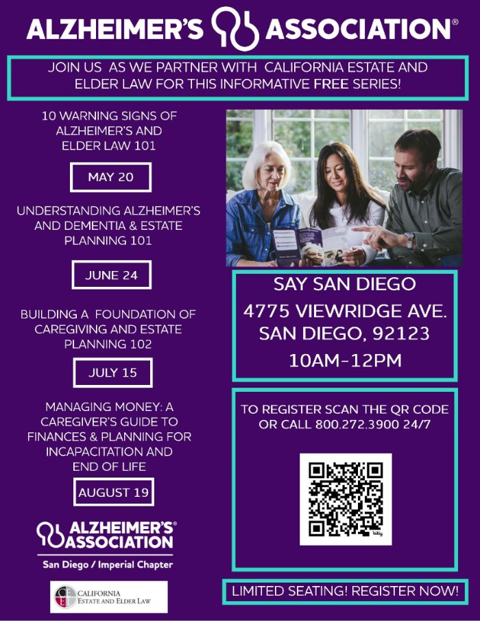 The Alzheimer's Association offers a variety of education programs to increase knowledge and to support those facing Alzheimer's disease. Trained presenters share education programs near San Diego and Imperial at regularly scheduled days/times or as needed for special situations. Learn about Alzheimer's disease, diagnosis, living with Alzheimer's and caregiving techniques