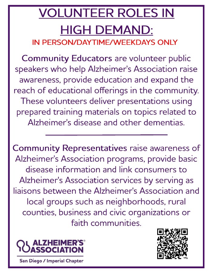 There are many ways to volunteer with the Alzheimer’s Association. We invite volunteers to present education sessions; help organize our Walk to End Alzheimer’s®, The Longest Day® and other fundraising activities; create social media stories, design graphics and more.