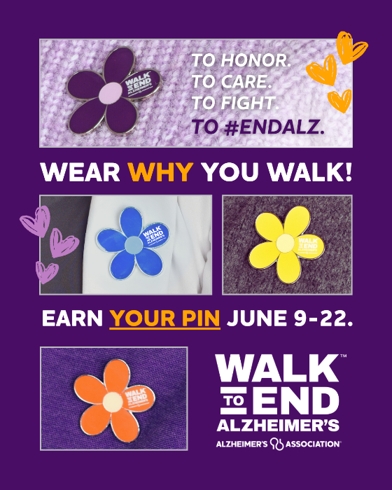 As we go purple this month to raise awareness of Alzheimer’s and all dementia, we are reminded that each of us has a story and a reason to end this disease. These reasons are never more on display than during our Promise Garden ceremony at each Walk to End Alzheimer’s event, a colorful display of determination to fight back against a disease that takes so much.That’s why we are so excited to offer a special Walk to End Alzheimer’s challenge this month! During June 9-22, you have a chance to earn your own Promise Garden flower pin to wear all year long. Just register for the 2025 Walk as a team captain, customize your fundraising webpage and make a self-donation during the challenge period to receive the pin as a gift of thanks.