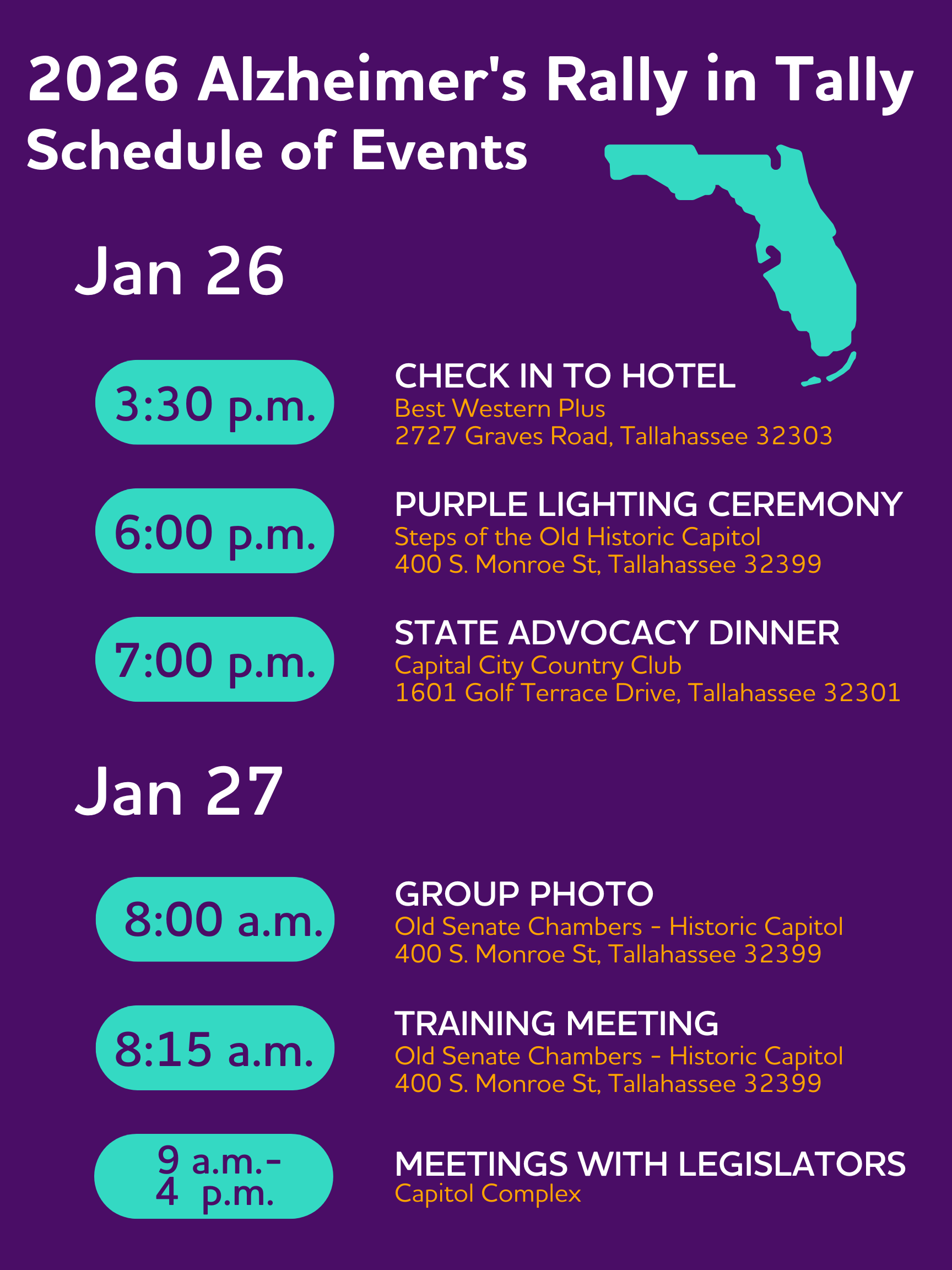 Join advocates from across the state on January 26-27, 2026, for the Alzheimer's Association annual Alzheimer's Rally in Tally. This is your opportunity to raise your voice, share your story, and advocate for critical legislation and funding in support of the 580,000 Floridians living with Alzheimer's and their caregivers.